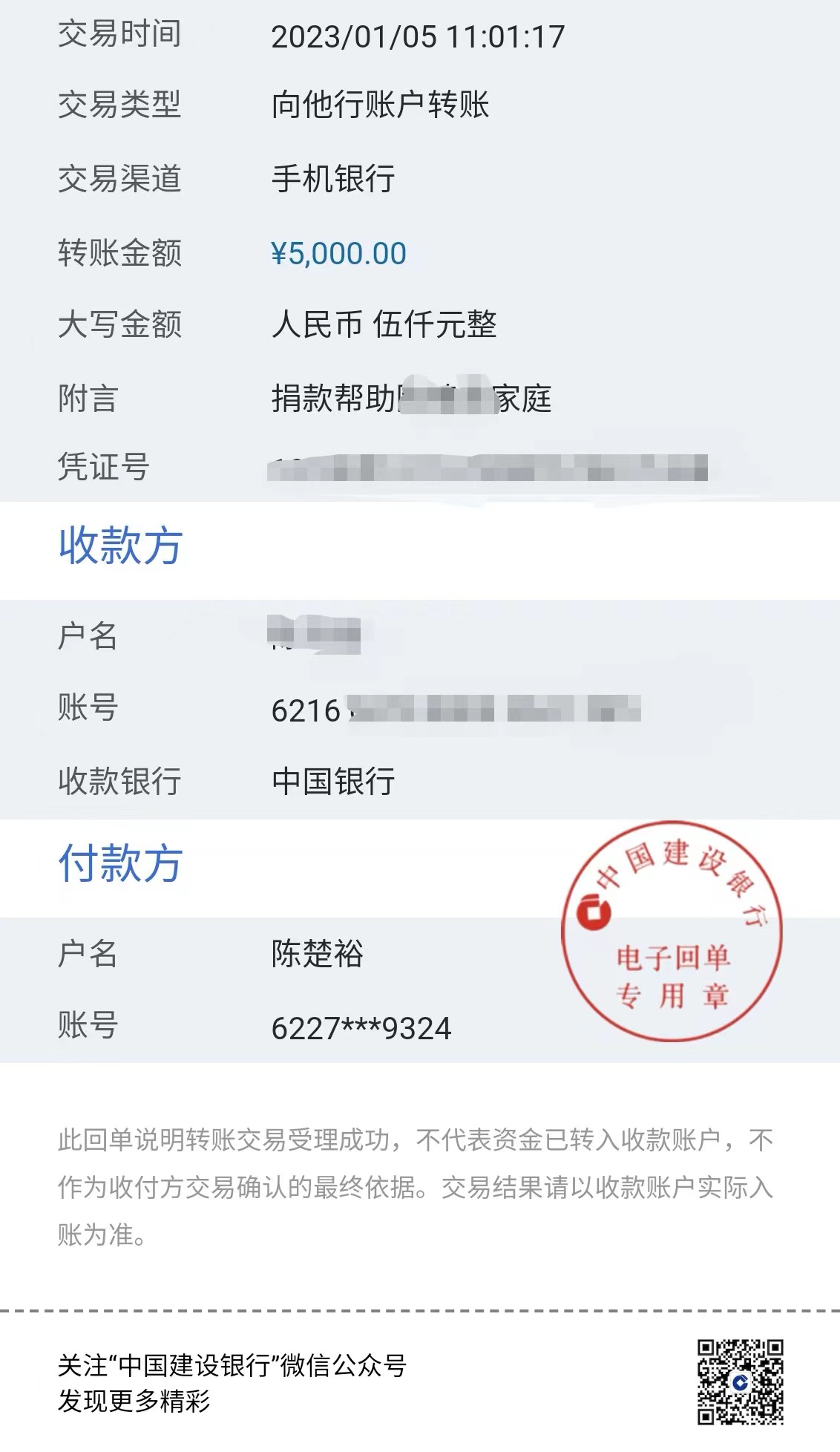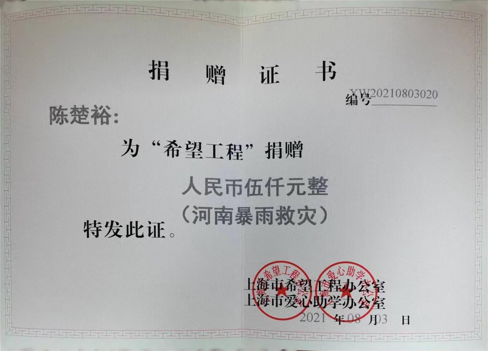 2021年08月03日律所主任陈楚裕律师向上海市希望工程办公室(河南暴雨救灾)捐款人民币5000元。