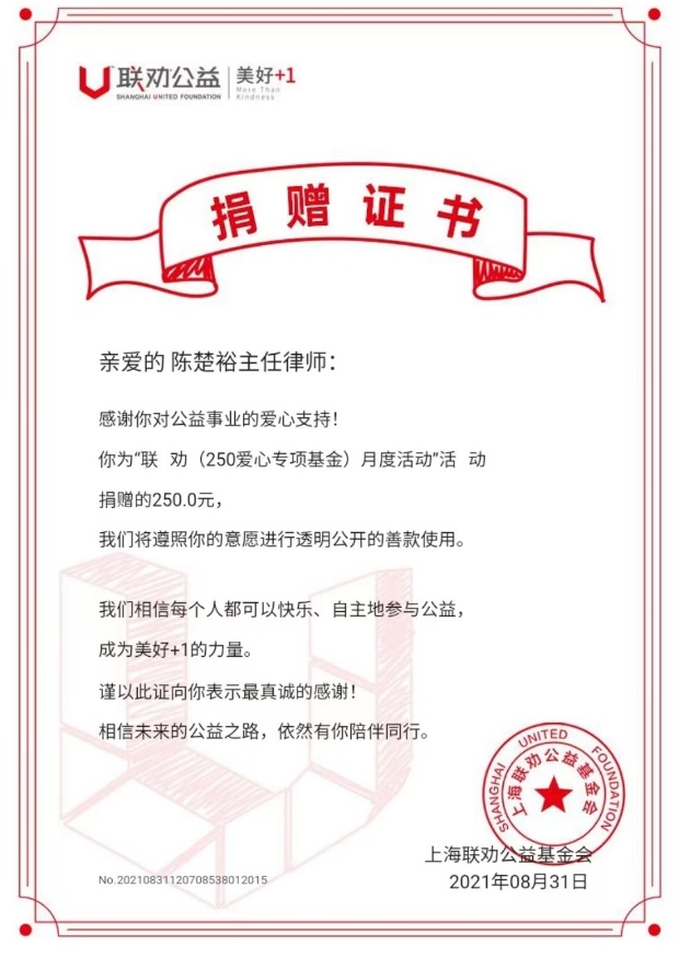 2020年11月07日到2021年8月31日律所主任陈楚裕律师累计向上海联劝公益基金会捐款1250元。