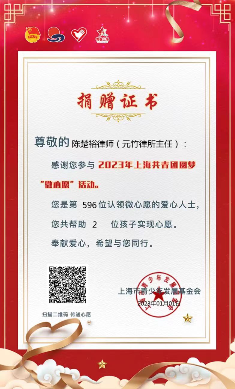 2023年01月01日元竹律所从“做好事善事”启航,助您圆梦,律所主任陈楚裕律师参与2023年上海共青团圆梦“微心愿”活动,奉献爱心帮助两位普陀区小朋友圆梦“微心愿”。